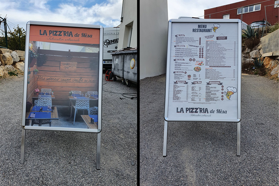 Nous avons accompagné cette pizzeria de Mèze pour créer un visuel clair, attractif et résistant à une utilisation quotidienne. Ce chevalet devient ainsi un véritable outil de communication de proximité, renforçant la visibilité de la pizzeria et invitant naturellement les clients à franchir la porte.