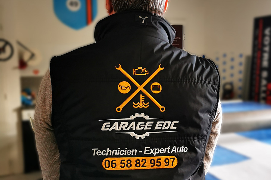 Pour ce garage automobile de Paulhan, nous avons réalisé le flocage personnalisé d’une doudoune afin d’habiller les équipes avec un vêtement à la fois pratique et professionnel. Le logo et le nom de l’entreprise sont apposés de façon visible, renforçant l’identité de la société tout en offrant un rendu soigné.