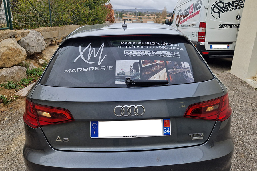 Pour cette marbrerie basée à Villeveyrac, nous avons conçu et posé un film micro-perforé personnalisé sur la lunette arrière de son véhicule professionnel. Ce support permet de diffuser un message clair et visible tout en conservant une excellente visibilité depuis l’intérieur.